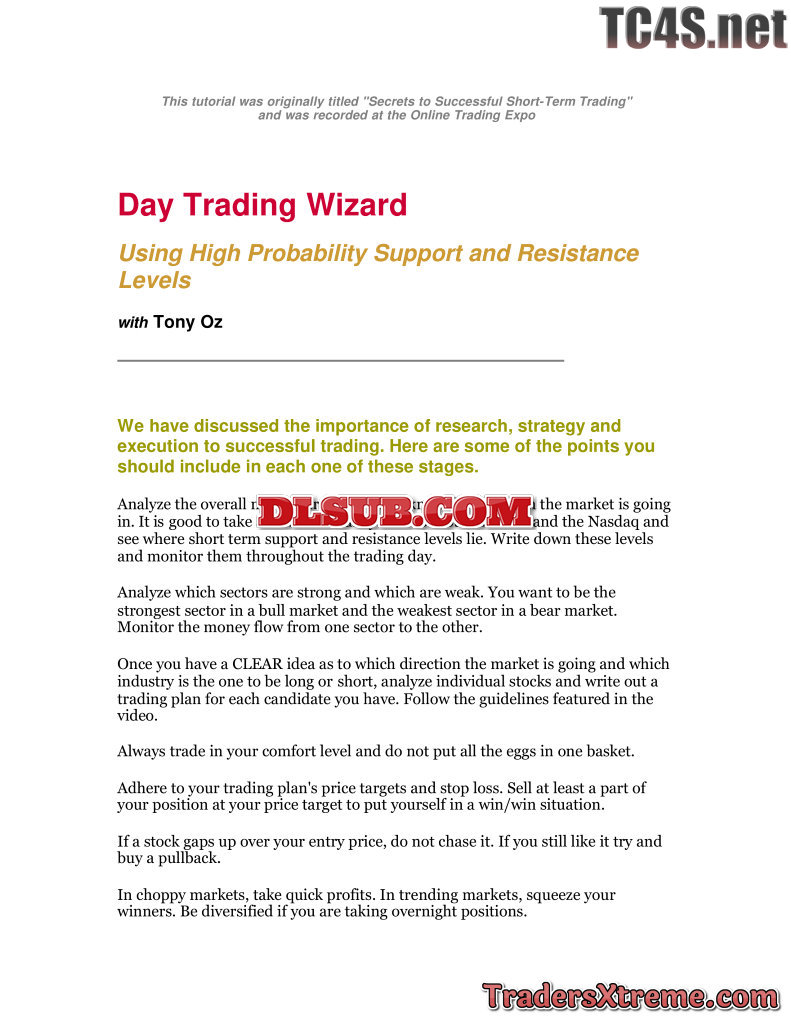 Tony Oz Day Trading Wizard Using High Probability Support And Resistance Levels - JPG Image File